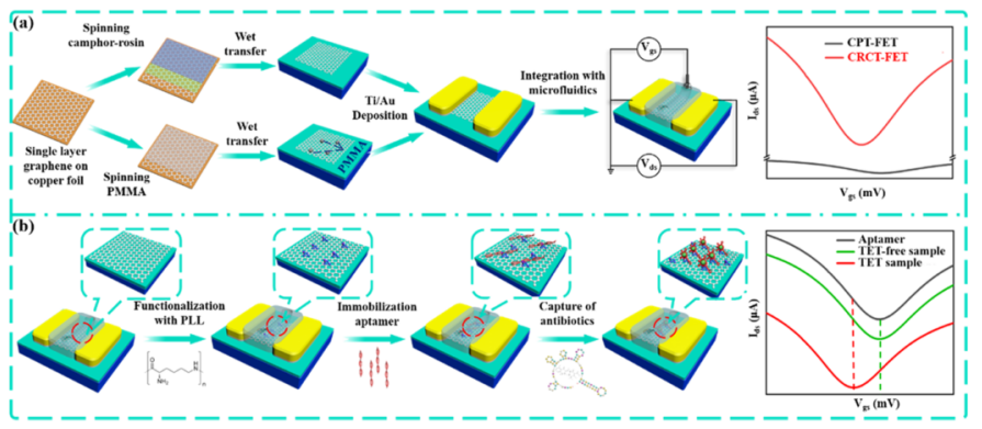 抗生素是治療細(xì)菌感染的有力工具,但抗生素污染正在成為有效治療人類細(xì)菌感染的嚴(yán)重威脅。近年來,水中抗生素的檢測一直是生物分析的重要研究領(lǐng)域。目前仍然迫切需要一種簡單的超敏檢測方法,以實(shí)現(xiàn)低濃度抗生素的準(zhǔn)確檢測。在這里,一個基于場效應(yīng)管(FET)的生物傳感器被開發(fā)使用超凈石墨烯和一個超靈敏的四環(huán)素檢測適配體。采用新設(shè)計(jì)的樟腦-松香清潔轉(zhuǎn)移(CRCT)方案制備了超齊墩果烯,與傳統(tǒng)的 PMMA 轉(zhuǎn)移(CPT)方法制備的 FET 相比,F(xiàn)ET 的載流子遷移率提高了10倍以上?;趫鲂?yīng)管,構(gòu)建并表征了適體功能化晶體管抗生素生物傳感器。對于穩(wěn)定性良好的 CRCT-FET 生物傳感器,其動態(tài)檢測范圍為5個數(shù)量級,靈敏度為21.7 mV/ten,檢測極限為100 fM,與采用 CPT 方法制備的生物傳感器相比,有了很大的改進(jìn)?;趯?shí)驗(yàn)結(jié)果和生物傳感模型,對 CRCT-FET 生物傳感器的抗生素傳感和傳感性能增強(qiáng)機(jī)理進(jìn)行了研究和分析。最后,從 Bohai Bay 入口取得的實(shí)際樣本中檢測到抗生素,從而驗(yàn)證了 CRCT-FET 生物傳感器。