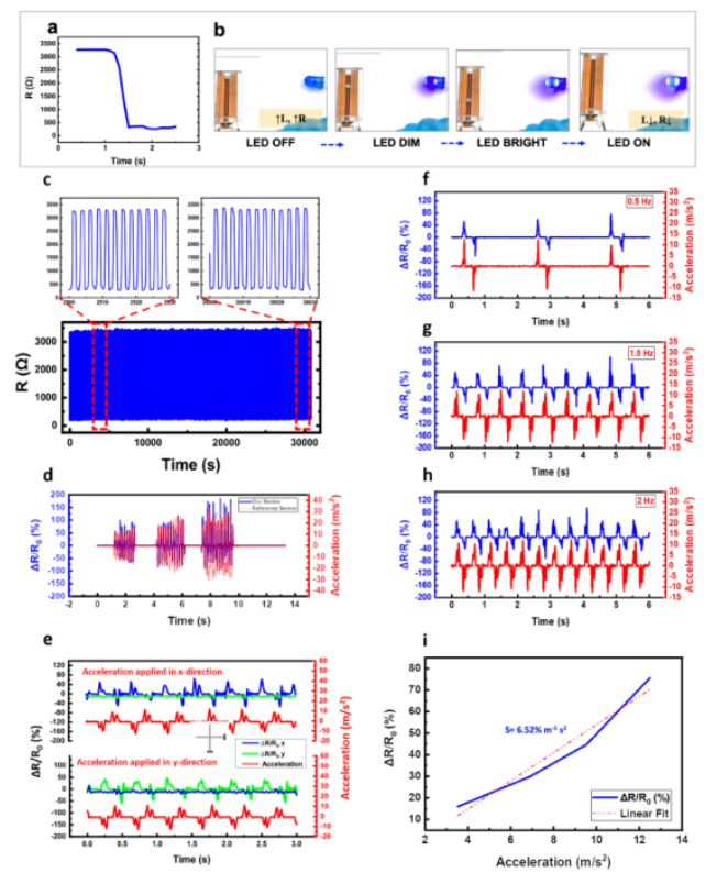 圖3. 基于液態(tài)金屬的慣性傳感器角色塑造。(a 和 b)通過控制 LED 的強(qiáng)度和電極的相應(yīng)電阻變化作為 LM 液滴位置的函數(shù),可視化 LM 啟用的可變電阻概念的時間推移序列圖像。(c) LM 型慣性電阻傳感器循環(huán)滾動試驗(yàn)的輸出。(d)慣性傳感器的電阻變化輸出相對于參考加速度計的輸出隨機(jī)應(yīng)用運(yùn)動。(e)當(dāng)沿 x 和 y 方向分別施加加速度時,組裝的兩軸傳感器的輸出。(f-h)慣性傳感器在軸加速度下的電阻變化輸出隨0.5 -2赫茲加速度頻率的變化。(i)輸出電阻隨加速度的變化。