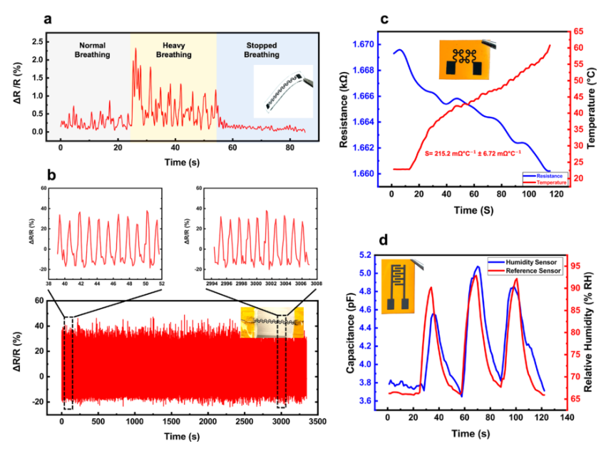 圖4. 多功能石墨烯-平臺角色塑造。(a)應(yīng)變傳感器連接到人體皮膚時測量呼吸模式的實(shí)時響應(yīng)。(b)應(yīng)變傳感器在6.5% 應(yīng)變電阻拉伸下的循環(huán)試驗(yàn)響應(yīng)。(c) LIG 溫度傳感器的電阻與環(huán)境溫度的角色塑造圖。(d)角色塑造濕度傳感器的電容與相對濕度圖(當(dāng)暴露于人體呼吸的交替間隔時間時)。