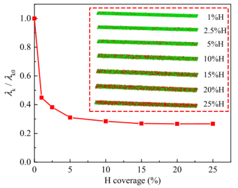 石墨烯、六方氮化硼(h-BN)及其異質(zhì)結(jié)構(gòu)由于其優(yōu)異的熱性能而成為很有前途的熱界面材料。對(duì)于異質(zhì)結(jié)構(gòu),廣泛的工作主要集中在二維(2D)石墨烯/h-BN (GBN)面內(nèi)異質(zhì)結(jié)構(gòu)的熱傳輸,其中石墨烯和h-BN在界面處結(jié)合。在這項(xiàng)研究中,我們通過(guò)非平衡分子動(dòng)力學(xué)(NEMD)模擬研究了三維(3D) GBN范德華(vdW)異質(zhì)結(jié)構(gòu)的熱導(dǎo)率。與2D GBN面內(nèi)異質(zhì)結(jié)構(gòu)不同,3D GBN vdW異質(zhì)結(jié)構(gòu)由三層組成,其中石墨烯通過(guò)vdW力夾在兩個(gè)h-BN片之間。各種技術(shù),包括氫功能化、空位缺陷、拉伸應(yīng)變、層間耦合強(qiáng)度、h-BN的層數(shù)、尺寸效應(yīng)和溫度,被廣泛地探索以找到調(diào)節(jié)熱導(dǎo)率的有效途徑。發(fā)現(xiàn)三層GBN vdW異質(zhì)結(jié)構(gòu)的熱導(dǎo)率對(duì)這些外在因素非常敏感。其中,氫官能化是最有效的方法。夾層石墨烯中1%的低氫覆蓋率可以導(dǎo)致vdW異質(zhì)結(jié)構(gòu)的熱導(dǎo)率降低55%。石墨烯上的空位缺陷比外層h-BN層中的B或N空位對(duì)vdW異質(zhì)結(jié)構(gòu)的熱導(dǎo)率降低產(chǎn)生更顯著的影響。這項(xiàng)工作揭示了通過(guò)結(jié)構(gòu)改變控制GBN vdW異質(zhì)結(jié)構(gòu)熱輸運(yùn)的物理機(jī)制,并為設(shè)計(jì)基于GBN vdW異質(zhì)結(jié)構(gòu)的新型熱管理器件提供了有用的指導(dǎo)。