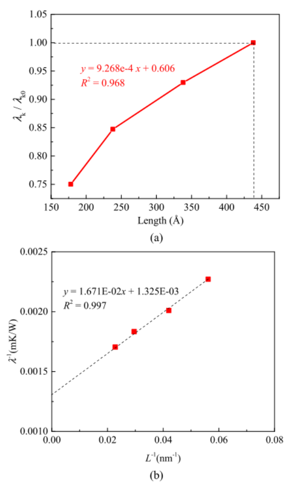 圖6.(a)不同長(zhǎng)度的GBN vdW異質(zhì)結(jié)構(gòu)的相對(duì)TC。(b)GBN vdW異質(zhì)結(jié)構(gòu)的逆長(zhǎng)度和逆TC之間的關(guān)系。