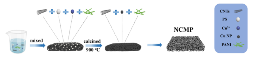 通過溫和的液相還原方法,無需表面活性劑或橋接分子,將銅納米顆粒均勻地負載在酸化的碳納米管(CNTs/Cu NPs)上。銅納米顆粒表面光滑,無雜質。然后,通過乳液聚合法制備聚苯乙烯(PS)微球,并與CNTs/Cu NPs (CNTs/Cu NPs/PS)復合。采用原位聚合法制備了納米銅/碳納米管為核,聚苯胺為殼的核-殼結構(PANI@CNTs/Cu NPs/PS)。在高溫下,PS開裂形成多孔結構,聚苯胺被碳化,實現(xiàn)了材料(NCMP)的氮摻雜。結果表明,酸化碳納米管在碳納米管的合成過程中起著至關重要的作用,使銅在碳納米管上持續(xù)生長。均勻分散的銅納米顆粒大小約為5 ~ 15 nm。當NCMP作為電極材料應用時,它表現(xiàn)出優(yōu)異的電化學性能,是一種高性能的超級電容器。