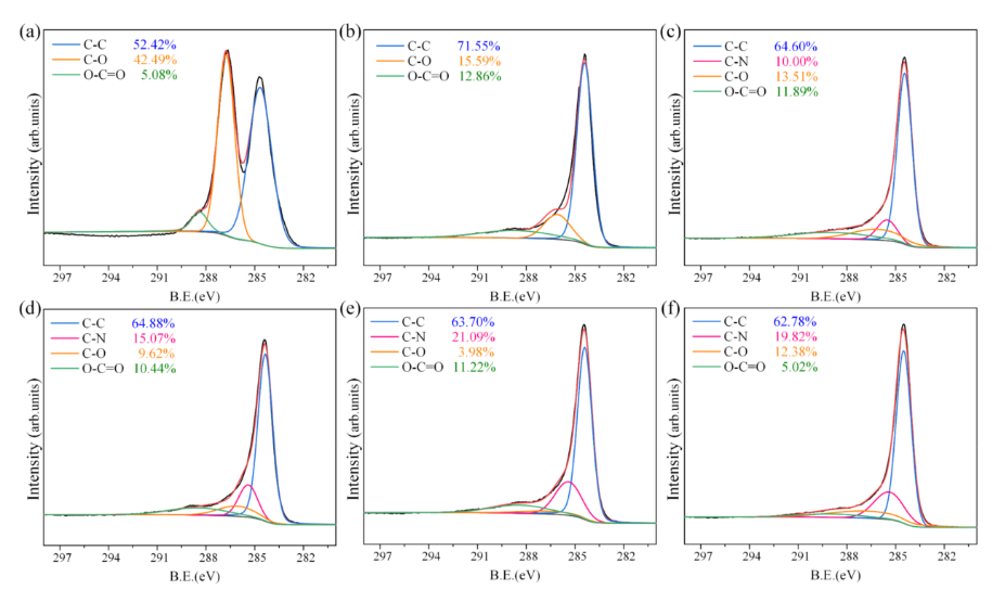 圖4. (a) GO, (b) CF-0, (c) CF-5, (d) CF-10, (e) CF-15和(f) CF-20的C 1s XPS譜。