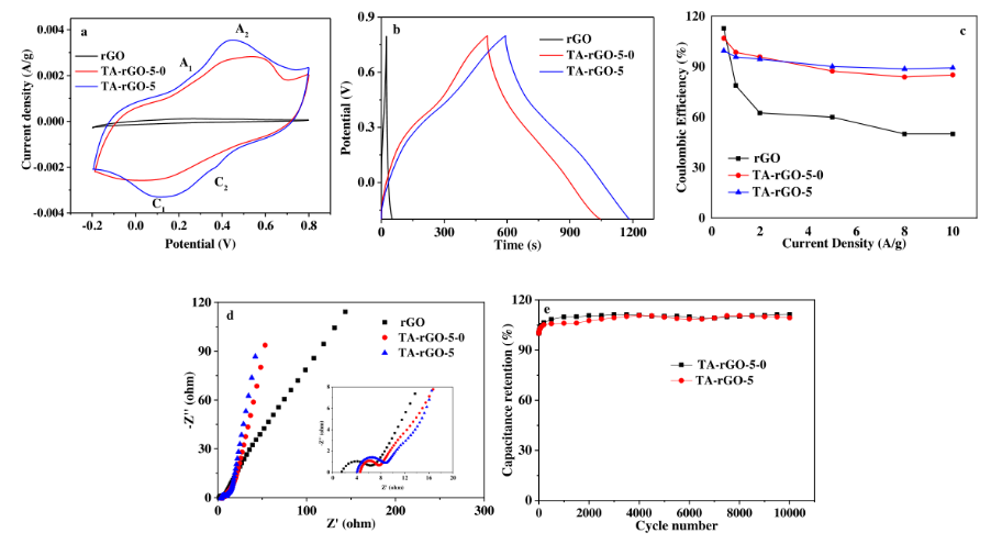 圖3. rGO、TA-rGO-5-0和TA-rGO-5電極的(a)5 mV/s 時的CV環(huán)路,(b) 0.5 A/g時的 GCD曲線,(c)庫侖效率和(d)Nyquist曲線; (e)TA-rGO-5-0和TA-rGO-5電極的循環(huán)穩(wěn)定性。