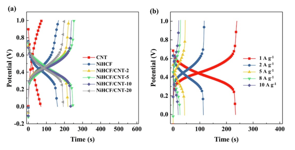 Figure 6. (a)CNT和NiHCF/CNT復合材料在1 A/g下的GCD曲線;(b)不同電流密度下NiHCF/CNT-5的GCD曲線。
