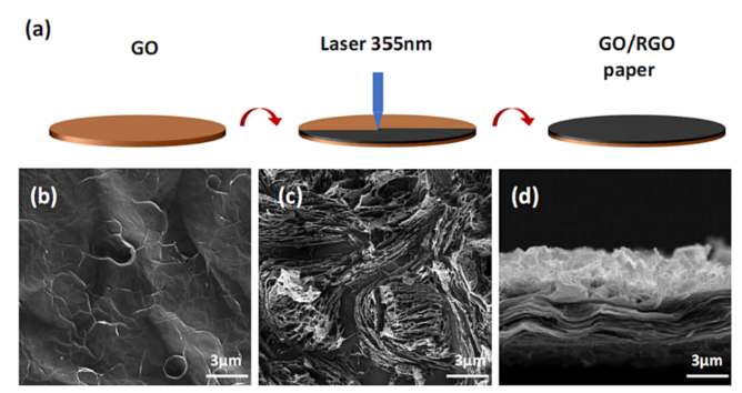 圖1. (a) GO/RGO紙的制備示意圖;(b) GO/RGO紙的SEM圖像,面向膜過濾器的一面;(c) GO/ RGO紙的SEM圖像,面對激光的一面,激光功率為1.9 W;(d) GO/RGO紙截面的SEM圖像。