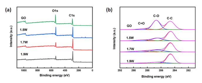 圖2. (a) XPS測量光譜;(b)在不同激光功率下制備的原始氧化石墨烯紙和氧化石墨烯/還原氧化石墨烯紙激光輻照面的C1s XPS譜。