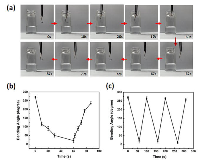 圖3. (a)氧化石墨烯/還原氧化石墨烯紙在乙醇蒸汽和空氣中的彎曲角度變化;(b)彎曲角度隨時間變化曲線;(c) GO/ RGO紙的可逆響應。