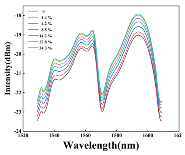 2/石墨烯材料吸收。它可以提供電荷轉(zhuǎn)移的條件,從而導(dǎo)致透射譜強(qiáng)度的變化。研究了該傳感器在體積分?jǐn)?shù)為0-35%范圍內(nèi)對(duì)甲烷濃度的傳感響應(yīng)。SnO