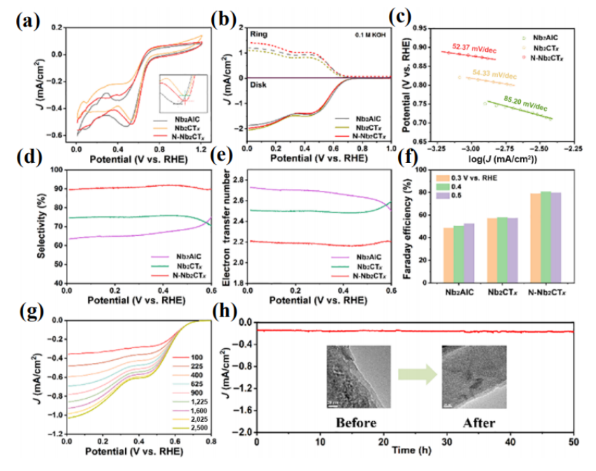 x的法拉第效率分別為60.35%和39.27%。觀察到50 h的理想催化穩(wěn)定性。密度泛函理論(DFT)計算表明,氮摻雜Nb