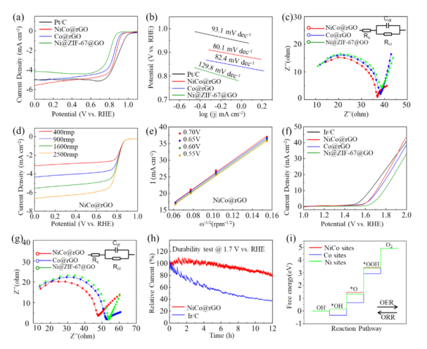 圖4. NiCo@rGO、Ni@ZIF-67@GO、Co@rGO和Pt/C 的(a) ORR的LSV曲線及(b)對(duì)應(yīng)的Tafel曲線;(c) ORR的EIS曲線;(d) NiCo@rGO在不同轉(zhuǎn)速下ORR的LSV曲線和(e) NiCo@rGO在不同電壓下對(duì)應(yīng)的K-L圖;(f) 1600 rpm時(shí)NiCo@rGO、Ni@ZiF-67@GO、Co@rGO和Ir/C的OER LSV曲線;(g) OER的EIS曲線;(h) NiCo@rGO和Ir/C OER的計(jì)時(shí)電流法曲線;(i)標(biāo)準(zhǔn)自由能OER/ORR通路圖。