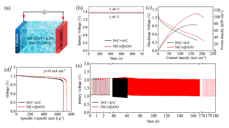 圖5. (a)鋅-空氣電池原理圖;(b) NiCo@rGo基電池開路電壓;(c)功率密度和放電極化曲線; NiCo@rGo和Ir/C Pt/C電池(d) 10 mA cm