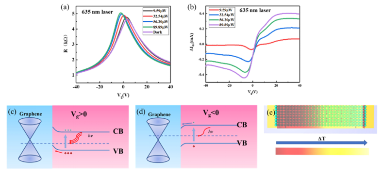 圖3. 在柵極電壓調(diào)節(jié)下,器件的通道電阻和光電流的變化,以及器件中的響應(yīng)機(jī)制示意圖。(a)和(b)電阻和光電流與器件的背柵電壓的函數(shù)。(c)和(d)器件在正負(fù)門電壓下的光電效應(yīng)。(e)器件的熱散射效應(yīng)。
