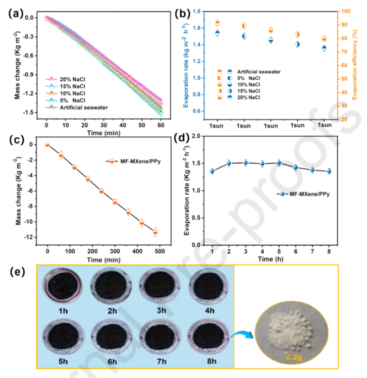 圖7 (a) MF-MXene/PPy在不同鹽度溶液中的質(zhì)量變化。(b) MF-MXene/PPy在不同鹽度溶液中的蒸發(fā)效率和速率。(c) MF-MXene/PPy在20 wt% NaCl中8小時(shí)的質(zhì)量變化。(d) MF-MXene/PPy在20 wt% NaCl中8小時(shí)的蒸發(fā)效率和蒸發(fā)速率(三次測(cè)量的6a-d平均值)。(e) MF-MXene/PPy在20wt%NaCl蒸發(fā)8 h時(shí)的上表面圖像。