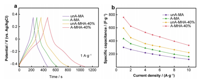 圖6 A-MA, A-MHA-20%, A-MHA-40%, A-MHA-60% 和 A-MHA-80%在1 Ag-1的GCD譜;在電流密度從1到10ag -1范圍內(nèi),由GCD分布計算的電容保持;c A-MA、A-MHA-20%、A-MHA-40%、A-MHA-60%、A-MHA-80%的Nyquist圖(Z0為阻抗實部,Z00為阻抗虛部);d、e A-MHA-40%在不同電流密度和掃描速率下的GCD譜圖和CV曲線;f A-MHA-40%的循環(huán)穩(wěn)定性。