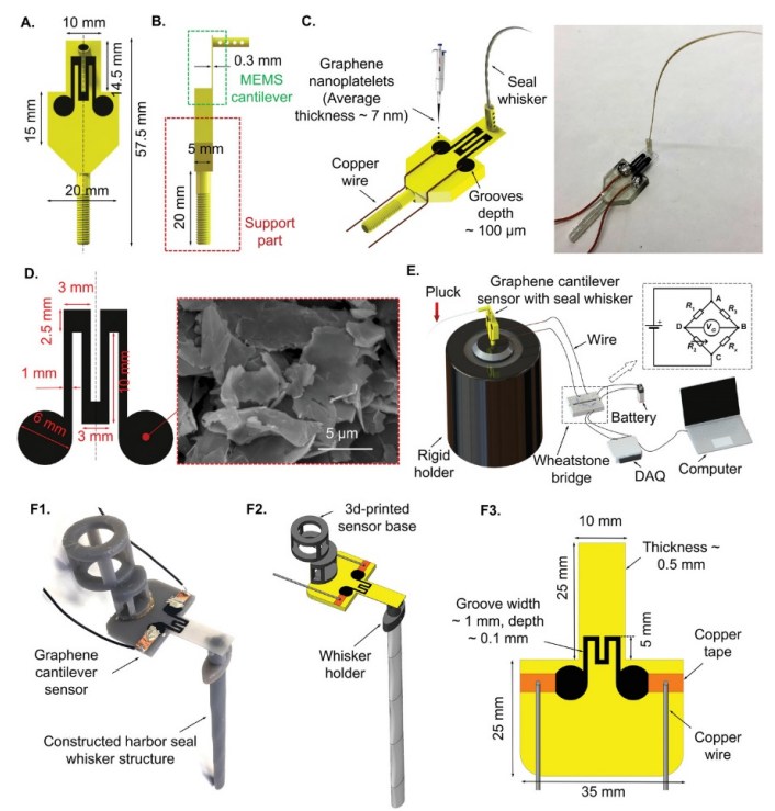 Fig 2. 懸臂式石墨烯傳感器。 A,B) 用于測量固有頻率的懸臂結(jié)構(gòu)傳感器尺寸(縱橫比≈50,厚度≈0.3 mm)。 C) 墨滴鑄造中的導(dǎo)電石墨烯納米片 (GNP) 和帶有胡須的懸臂梁傳感器原型。D) GNP 染色規(guī)的尺寸和微通道中石墨烯納米片的掃描電子 (SE) 顯微照片(深度≈100 µm)。 E) 顯示基于懸臂傳感器的自然頻率測量的實(shí)驗(yàn)裝置的示意圖。用于胡須的 WIV 和 VIV 測量的石墨烯懸臂傳感器的 F1) 原型和 F2) CAD 模型。使用熱熔膠將 3D 打印傳感器連接到 3D 打印傳感器底座。接下來,將 3D 打印的胡須結(jié)構(gòu)插入 3D 打印的胡須支架中,該胡須支架連接到 3D 打印傳感器的末端。 F3) 懸臂傳感器的尺寸。