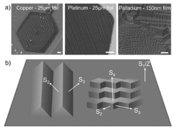 圖1. a) 使用掃描電子顯微鏡(SEM)在不同基底上合成石墨烯片后觀察到的刻面結(jié)構(gòu)。所有比例尺為1微米。 b) 刻面的示意圖。S1/Z代表襯底表面的晶體方向。左圖:有兩個(gè)面的單向結(jié)構(gòu)--S2和S3。右邊。有三個(gè)面的金字塔結(jié)構(gòu)--S2、S3和S4。