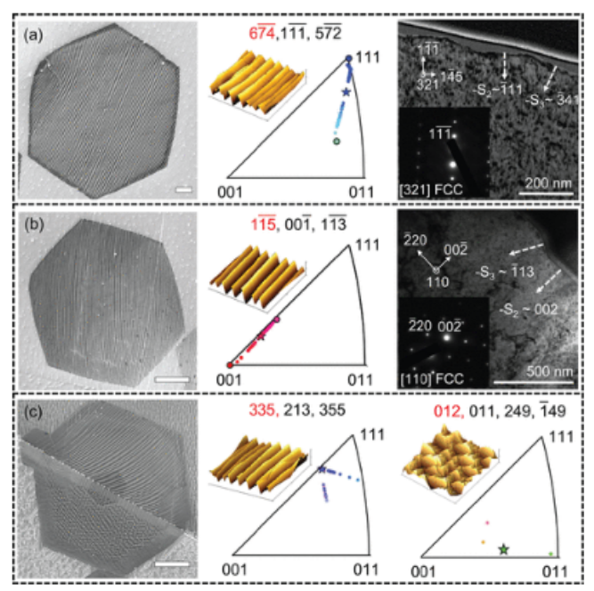 圖3. a, b) 從左到右。分析區(qū)域的SEM圖像;S1(紅色)、近似S2和S3(黑色)的米勒指數(shù);3D AFM掃描(插圖);標(biāo)準(zhǔn)IPF顏色方案中的S1(星)、S2和S3(圓)的IPF圖。使用透射電子顯微鏡(TEM)對(duì)各系統(tǒng)進(jìn)行驗(yàn)證,插圖。c) 左圖:兩個(gè)晶粒上的石墨烯的SEM圖像,顯示單向(晶界以上)和金字塔(晶界以下);米勒指數(shù),AFM掃描(插圖)和單向(中間)和金字塔面(右圖)的IPF圖。