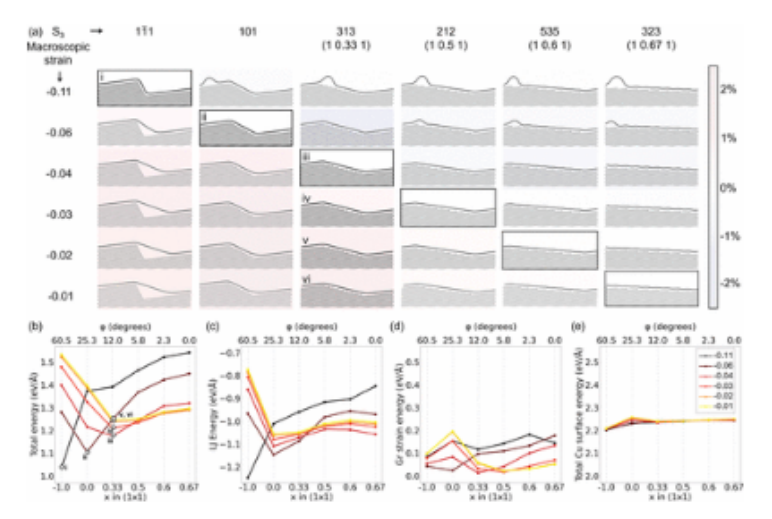 圖4. a) 銅上石墨烯不同初步宏觀應(yīng)變的分子靜力學(xué)模擬。S1=(323),S2=(111),S3從(11?1)到(323)跨列變化。行中表示石墨烯的宏觀應(yīng)變,將其邊緣釘在單元上??騼?nèi)的單元格顯示最小應(yīng)變的情況,而模擬單元格(i-vi)代表S3方向,對(duì)應(yīng)于該特定釘住長(zhǎng)度的最低總能量。松弛后的石墨烯應(yīng)變是用顏色圖表示的。b-e)總能量,石墨烯和銅之間的Leonard-Jones(LJ)能量,石墨烯的應(yīng)變能量和銅的總表面能量,每個(gè)S1長(zhǎng)度,分別與每個(gè)銷釘長(zhǎng)度的S3方向繪制。圖(b-e)中的下橫軸是(1x1)平面上的x,用上橫軸上的S1和S3之間的角度計(jì)算。