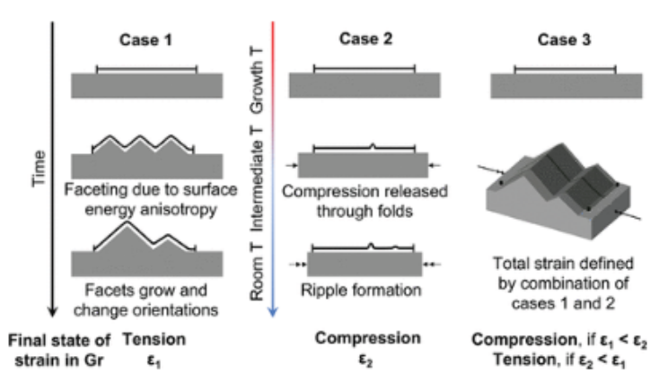 圖5. 應(yīng)變(ε)積累的示意圖。情況1:由于生長(zhǎng)溫度下的刻面,表面積的增加引起張力。情況2:生長(zhǎng)后的冷卻由于熱不匹配而引起壓縮。案例3:石墨烯的應(yīng)變狀態(tài)(拉伸/壓縮)是由于案例1和2的組合。
