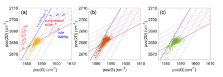 圖3.在(a)15、(b)10和(c)5分鐘的生長時間下,銀樣品上PECVD石墨烯的2D峰位置“pos(2D)”與G峰位置“pos(G)”,根據(jù)Lee等人的分析,顯示所有樣品中的輕微空穴摻雜和壓縮應(yīng)變,應(yīng)變的正值對應(yīng)于拉伸應(yīng)變。