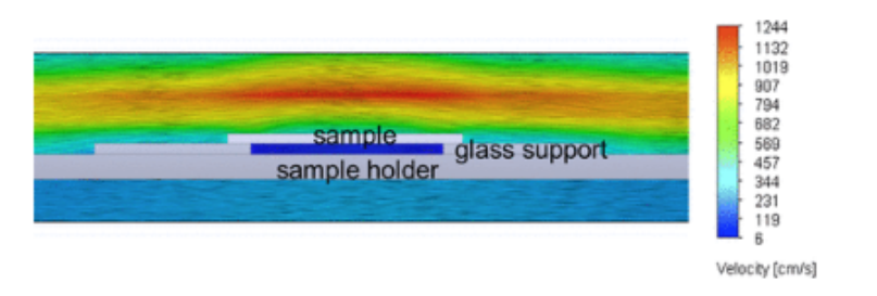 圖4.過CFD模擬獲得的石墨烯生長翻轉(zhuǎn)襯底周圍氣體速度分布的側(cè)視圖。