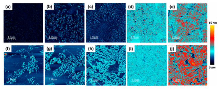 圖2:用CuPc(頂部)和MFPc(底部)功能化的石墨烯表面在不同表面覆蓋率下的AFM形貌圖。(a) CuPc_C1:22%,(b)CuPc_C2:37%,(c)CuPc_C3:69%。