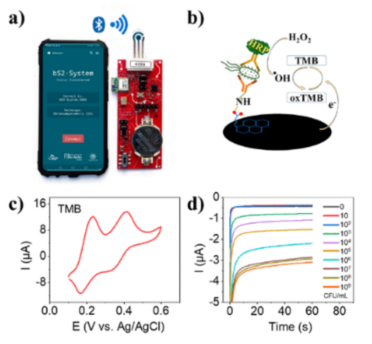 圖5.(a) 智能手機控制的便攜式無線系統(tǒng)用于大腸桿菌檢測(不按比例)。(b)說明電化學(xué)酶聯(lián)免疫吸附試驗(ELISA)的工作機制。(c)TMB在功能化T-LRGO電極上的循環(huán)伏安圖。(d)不同大腸桿菌濃度的代表性電流與時間瞬變,記錄為+0.125 V vs Ag/AgCl。