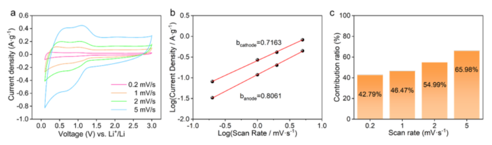 2速率能力測試的b值和(c)不同掃描速率下電容的貢獻比。