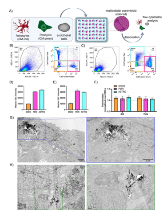 圖5. GO和FLG與BBB的三維人類多細(xì)胞集合體模型的相互作用:流式細(xì)胞儀和TEM分析。(A) 預(yù)染hMCA形成和解離的工作流程示意圖。(B) NHA、hBPV和hCMEC/D3的三個(gè)獨(dú)立培養(yǎng)物在流式細(xì)胞儀上一起運(yùn)行時(shí),SSC與FSC(前向散射)的點(diǎn)圖和細(xì)胞追蹤器紅色(星形膠質(zhì)細(xì)胞)和綠色(周細(xì)胞)的門控。(C) 解離的hMCA的SSC與FSC和細(xì)胞追蹤器紅色(星形膠質(zhì)細(xì)胞)和綠色(周細(xì)胞)的點(diǎn)陣圖。(D) 在流式細(xì)胞儀上獨(dú)立運(yùn)行的三種細(xì)胞類型(NHA、hBPV和hCMEC/D3)的平均SSC定量。(E) 三個(gè)細(xì)胞型(NHA、hBPV和hCMEC/D3)在hMCA解離后的平均SSC定量。數(shù)據(jù)表示為平均值±SEM(n = 2)。(F) 不同細(xì)胞型對(duì)GO和FLG的吸收,以SSC的倍數(shù)比對(duì)照細(xì)胞增加表示。數(shù)據(jù)表示為平均值±SEM(n = 3)。暴露于GO(G)和FLG(H)的hMCA的TEM顯微照片,顯示了周邊細(xì)胞層的罕見材料內(nèi)化。
