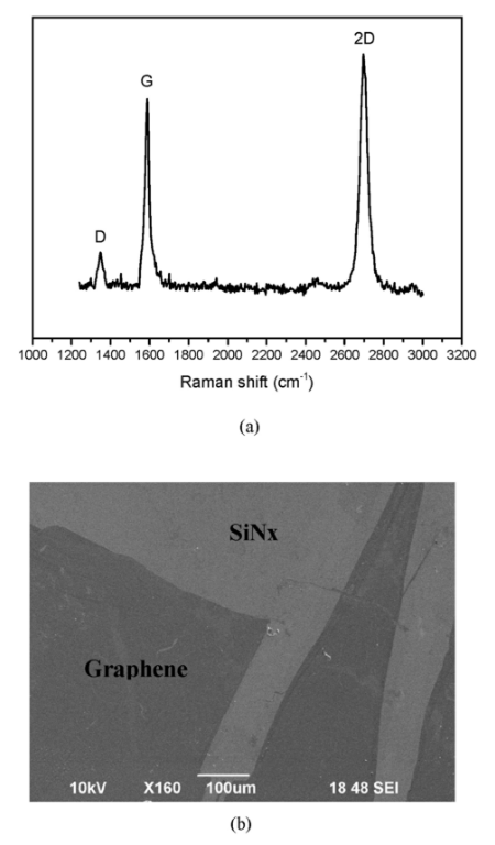 圖2. (a)單層石墨烯的拉曼光譜。(b)器件表面石墨烯和SiNx的SEM圖譜。