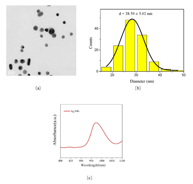 圖3. (a) Ag NPs的透射電鏡(TEM)。(b) Ag NPs透射電鏡得到的Ag NPs粒徑分布。(c) Ag NPs的吸收光譜。