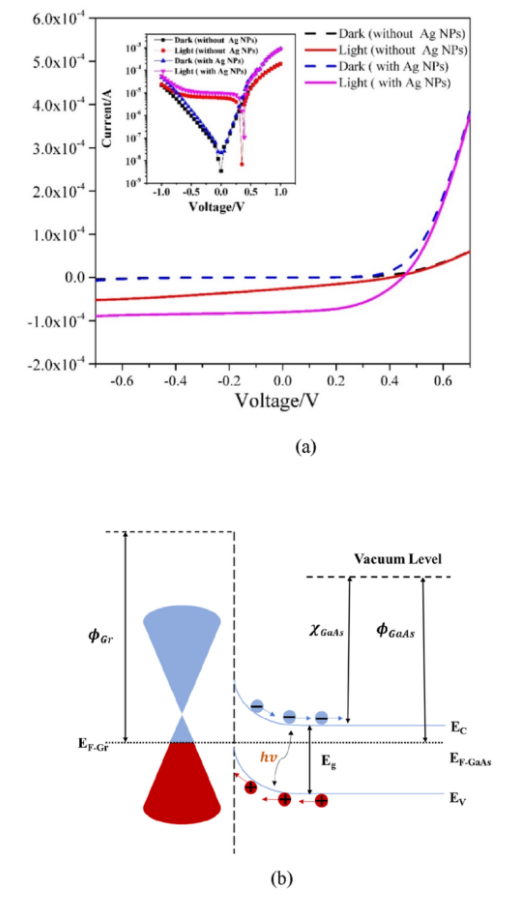 圖5. (a)兩種器件在黑暗和1mW入射光下的I-V特性。(b) 含Ag NPs的器件在反向偏置下的能帶圖。