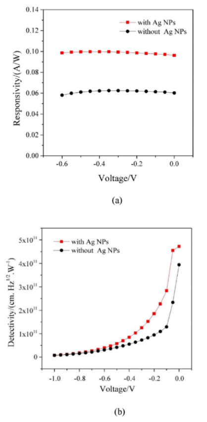 f)分別為28.21 μs/68.11 μs。與不含Ag NPs的器件相比,該探測器的量子效率從37%提高到84%。這表明石墨烯/砷化鎵光電探測器在近紅外探測領(lǐng)域具有廣闊的應(yīng)用前景。