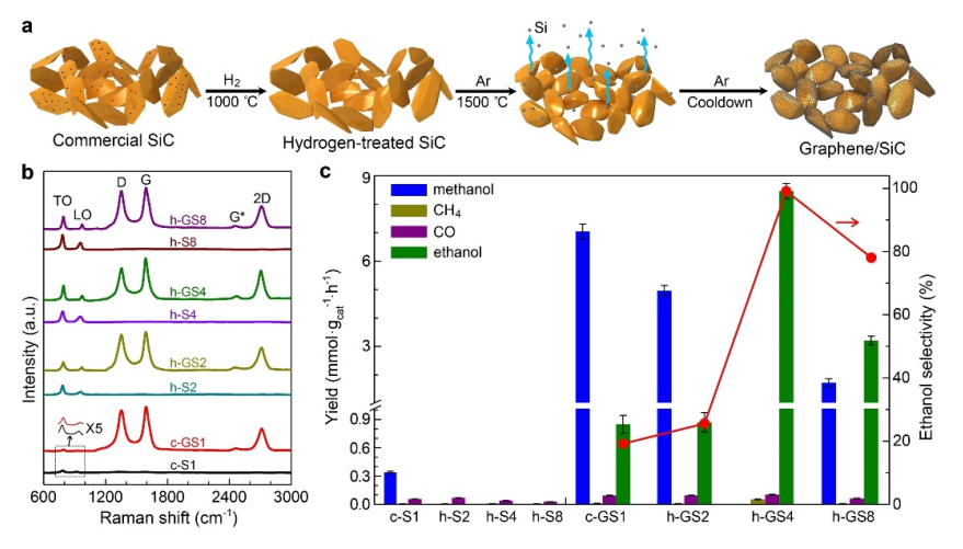 Fig 1. 合成方案、拉曼光譜和CO2光電催化性能。a) 石墨烯/SiC 復(fù)合材料制備示意圖。b) 100 nm 立方 SiC (c-S1) 和 200 nm (h-S2)、400 nm (h-S4) 和 800 nm (h-S8) 六方 SiC 以及相應(yīng)外延生長的石墨烯的拉曼光譜/SiC 復(fù)合材料:c-GS1、h-GS2、h-GS4 和 h-GS8。c)裸SiC和石墨烯/SiC樣品的CO2光電催化性能比較。