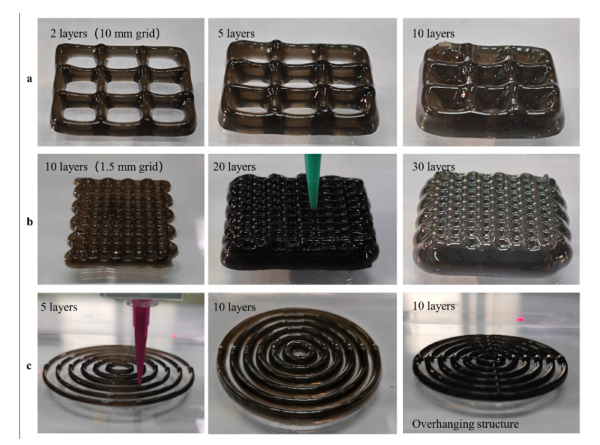 圖2. 3D打印SGC水凝膠:(a)柵格為10mm的九格三維結(jié)構(gòu)。(b)柵格為1.5mm的分層網(wǎng)狀三維結(jié)構(gòu)(c) 3D打印高縱橫比結(jié)構(gòu)上的懸垂特征。