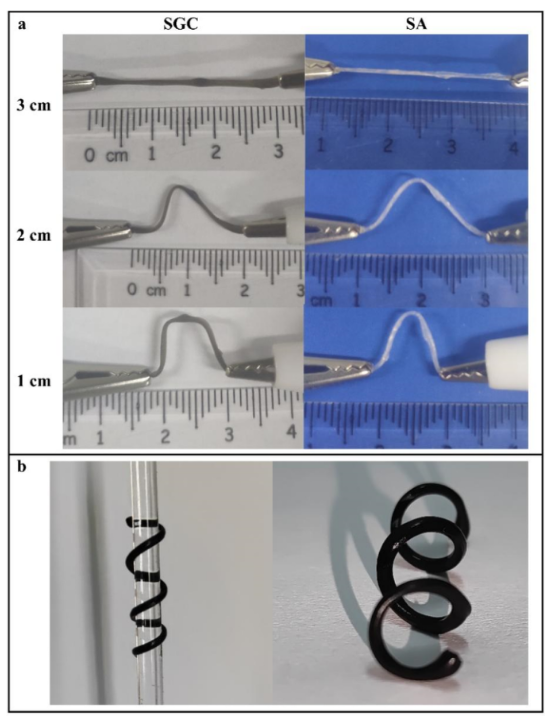 圖4. SGC水凝膠和SAHs優(yōu)異的柔性:(a)彎曲水凝膠的電導(dǎo)率測量過程。(b) SGC水凝膠的柔韌性和可塑性。