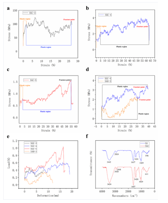 圖5. SGC水凝膠和SAHs的力學(xué)性能及FT-IR圖譜: a) SGC-3 (d=0.0712 mm, L=30 mm)的應(yīng)力-應(yīng)變圖。b) SGC-4(d = 0.440 mm, L= 30 mm)的應(yīng)力-應(yīng)變圖。c) SGC-5(d=0.915 mm, L= 30 mm)的應(yīng)力-應(yīng)變圖。d) SGC-4和SAH-3的應(yīng)力-應(yīng)變對比圖。e) SGC水凝膠與SAHs的載荷變形對比圖。f) SGC水凝膠和SAHs的紅外光譜。