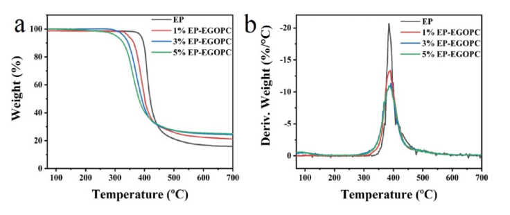 圖2. EP及其納米復合材料的TGA (a)和DTG (b)曲線。