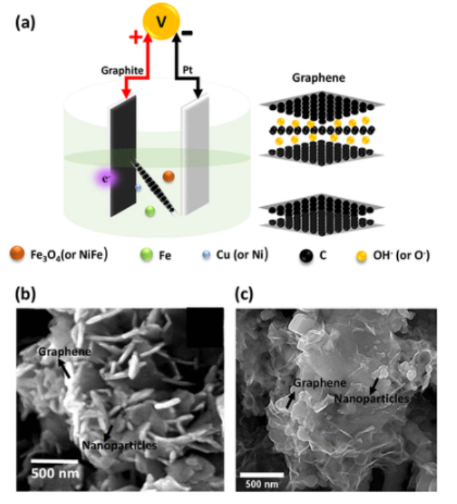 圖1. (a) 石墨剝離和石墨烯、鎳、銅和鐵共沉積的示意圖,用于制備納米復(fù)合材料。(b)Gr/NiFe和(c)Gr/CuFe粉末的FESEM圖像。