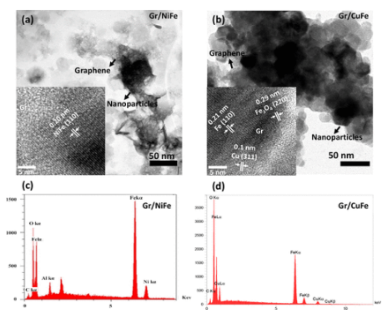 圖2. (a) Gr/NiFe粉末和(b) Gr/CuFe粉末的TEM圖像。(a)和(b)的插圖分別顯示了Gr/NiFe粉末和Gr/CuFe粉末的HRTEM圖像。(c)Gr/NiFe粉末和(d)Gr/CuFe粉末的EDS結(jié)果。