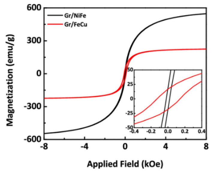 圖4. Gr/NiFe和Gr/CuFe粉末的室溫磁化曲線。樣品的飽和磁化值為547和225 emu/g,Gr/NiFe和Gr/CuFe粉末的矯頑力(Hc)值分別為30和100 Oe。此外,所制備的粉末的剩磁(Mr)在Gr/NiFe和Gr/CuFe粉末中分別為45和16.8 emu/g。