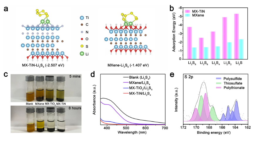 Fig 3. (a) MX-TiN及MXene對Li?S?的優(yōu)化吸附模型;(b)MX-TiN及MXene對不同多硫化鋰的吸附能對比;(c)可視化吸附實驗;(d)吸附后多硫化鋰溶液的紫外可見光吸收譜;(e)MX-TiN吸附多硫化鋰后的硫元素XPS譜。
