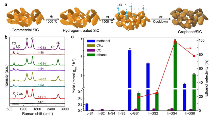2光電催化性能。a) 石墨烯/SiC 復合材料制備示意圖。b) 100 nm 立方 SiC (c-S1) 和 200 nm (h-S2)、400 nm (h-S4) 和 800 nm (h-S8) 六方 SiC 以及相應外延生長的石墨烯的拉曼光譜/SiC 復合材料:c-GS1、h-GS2、h-GS4 和 h-GS8。c)裸SiC和石墨烯/SiC樣品的CO