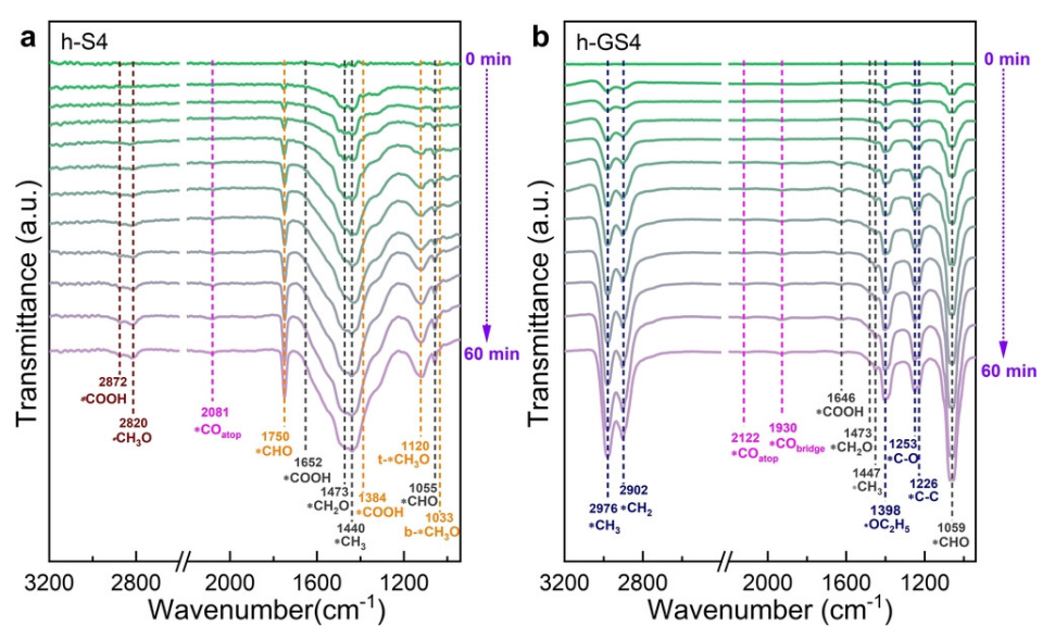 Fig 3. 檢測反應中間體。在不同光照射時間下, CO2和 H2O 蒸氣混合物在 a) h-S4 和 b) h-GS4 上的共吸附原位 ATR-FTIR 光譜。