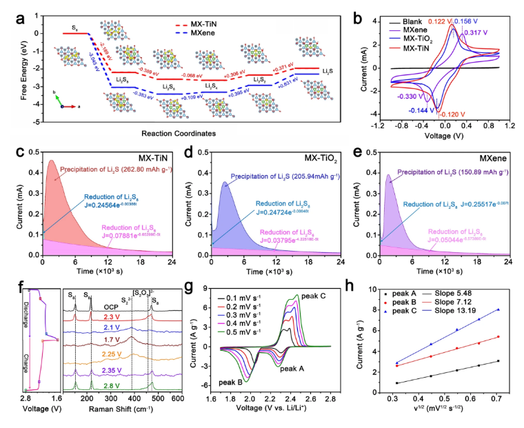 Fig 4. (a) 多硫化鋰在MX-TiN及MXene表面的轉(zhuǎn)化勢(shì)壘;(b)對(duì)稱電池的CV曲線;(c-e)不同樣品的硫化鋰沉積曲線;(f)S/MX-TiN不同充放電位置的非原位Raman曲線;(g)S/MX-TiN在不同掃速下的CV曲線;(h)I-v1/2線性擬合。