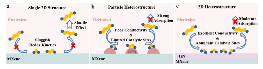 Fig 5. (a-c) 不同樣品對(duì)多硫化鋰的吸附及催化機(jī)理示意圖。