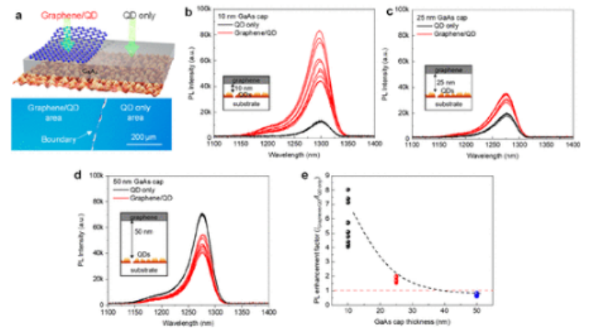 由于表面載流子損耗的增加,制造高量子效率的納米級器件是一個挑戰(zhàn)。低維材料如0D量子點和二維材料已被廣泛研究,以減輕損失。在這里,我們展示了石墨烯/III-V量子點混合維度異質(zhì)結(jié)構(gòu)的強烈光致發(fā)光增強。與只有量子點的結(jié)構(gòu)相比,二維/零維混合結(jié)構(gòu)中石墨烯和量子點之間的距離決定了載流子輻射重組的增強程度,從80%到800%。時間分辨的光致發(fā)光衰減也顯示,當(dāng)距離從50納米減少到10納米時,載流子壽命增加。我們提出,光學(xué)增強是由于能帶彎曲和空穴載流子轉(zhuǎn)移,這修復(fù)了量子點中電子和空穴載流子密度的不平衡。這種二維石墨烯/0D量子點異質(zhì)結(jié)構(gòu)顯示了高性能納米級光電器件的前景。