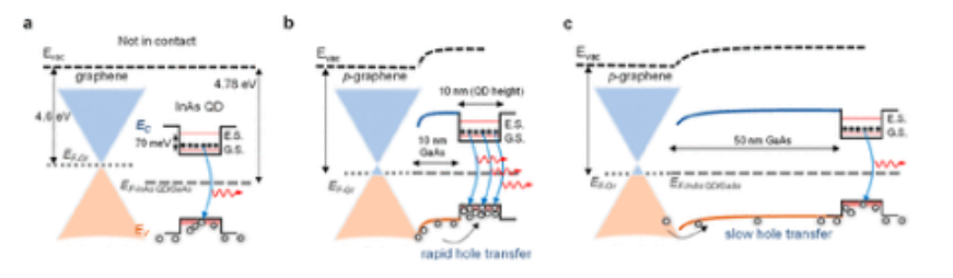 圖3. 石墨烯/量子點異質(zhì)結(jié)構(gòu)的能帶排列示意圖。(a) 石墨烯和量子點沒有接觸。(b)10納米的間距和(c)50納米的間距?;鶓B(tài)(G.S.)和激發(fā)態(tài)(E.S.)的能量在量子點內(nèi)表示。藍色彎曲的箭頭表示輻射轉(zhuǎn)換。為簡單起見,圖中省略了InAs潤濕層和InGaAs量子阱。