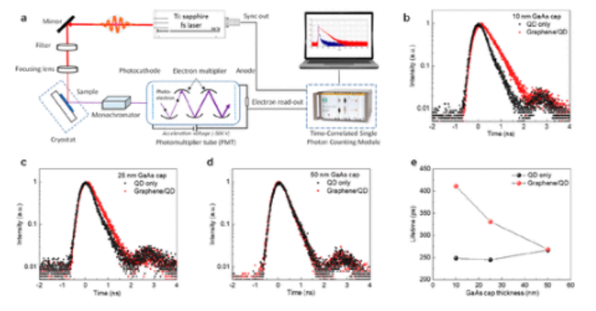 圖4. 室溫下的時間分辨光致發(fā)光測量,使用800nm波長的脈沖激光,80MHz的重復(fù)率(12.5ns的間隔),20mW的平均激發(fā)功率,<100fs的脈沖寬度。(a) 儀器設(shè)置。(b-d) 10、25和50納米GaAs帽量子點樣品的時間分辨光致發(fā)光衰減。(e) 儀器響應(yīng)時間校正的輻射量子點載流子壽命。每個數(shù)據(jù)點代表四個或更多測量的平均值。